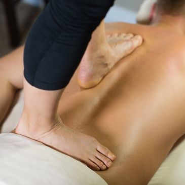 Applies deep, even pressure using the therapist’s feet to ease muscle knots and tension.
